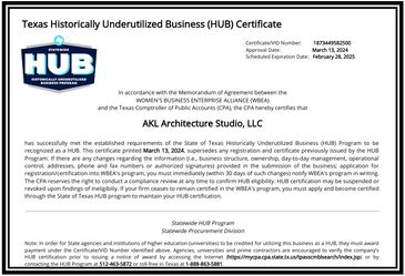 AKL Architecture Studio, LLC is a Texas based architecture, design, and planning firm that is 100% woman owned and operated. Established in October 2021, we pride ourselves on delivering high quality architectural design services and believe in designing dreams. Every project for us is a way we can make a positive change in the world. AKL Architecture Studio, LLC works collaboratively with clients and end users to make every detail of a project successful.