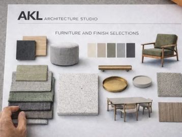 Our interior architecture services include furniture and finish selections supported by virtual finish boards that clearly communicate material palettes and design intent. Virtual finish boards are included as part of our basic services, with physical finish boards available upon request.